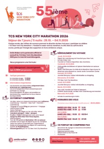 • Les dossards sont disponibles uniquement dans la formule vol + hébergement. • Les accompagnateurs sans dossard peuvent participer au voyage. • Une prolongation du séjour est possible sur demande avec supplément et sous réserve de disponibilité. EN393 LUX–FRA 10:35 11:25 03.11.2026 : 04.11.2026 : DÉROULEMENT DU VOYAGE CE FORFAIT COMPREND Séjour de 7 jours / 5 nuits : 29.10. – 04.11.2026 Chaque année, des milliers de coureurs prennent la direction de New York pour y participer au célèbre « TCS New York City Marathon ». Pendant le week-end du marathon, la ville vibre au rythme de la course, portée par l'énergie des supporters et d'une ambiance unique. Jeudi, 29.10.2026 • Vol aller-retour en classe économique avec Lufthansa : Luxembourg – Francfort – New York – Francfort – Luxembourg • 1 bagage en soute 23 kg par personne + 1 bagage cabine jusqu’à 8 kg • Taxes d’aéroport • Réservation de sièges sur les vols aller-retour • Transferts aéroport - hôtel - aéroport • 5 nuits à l’hôtel (hébergement seul, sans repas) • Tempo by Hilton New York Times Square, 1568 Broadway • Tour de ville guidé de Manhattan (4h) en autocar • Transfert vers la ligne de départ le jour du marathon (selon les options proposées par l’organisateur) • Guide accompagnateur au départ du Luxembourg à partir de 15 participants • Dossard garanti pour le TCS New York City Marathon • Départ de Luxembourg via Francfort pour New York. • Arrivée à New York. • Transfert à l’hôtel et répartition des chambres. • Visite guidée de Midtown et Uptown Manhattan en autocar le matin. Informations importantes Vendredi, 30.10.2026 • Après-midi libre pour la visite de la Marathon Expo et pour le retrait de votre dossard au Jacob Javits Convention Center. Samedi, 01.11.2026 • Journée libre pour visites individuelles ou shopping. Dimanche, 01.11.2026 • TCS New York City Marathon. Lundi, 02.11.2026 • Journée libre pour visites individuelles ou shopping. Mardi, 03.11.2026 • Vers midi, transfert de l'hôtel à l'aéroport. • À 15h55, heure locale, vol New York-Luxembourg via Francfort. Mercredi, 04.11.2026 • Arrivée à Luxembourg le matin. HORAIRES DES VOLS (horaires sous réserve de modifications) : 29.10.2026 : Emile Weber est le partenaire officiel et exclusif du TCS New York City Marathon 2026 pour le marché luxembourgeois. Nous proposons une formule : Vol + hébergement + dossard garanti àpd. 4.150€ par personne LH402 FRA–EWR 13:30 17:00 LH401 JFK–FRA 15:55 05:15+1 EN390 FRA–LUX 06:45 07:35 • Assurance de voyage ou assurance annulation (recommandée) • Dépenses personnelles • Abbott Dash to the Finish 5K • Pourboires CE FORFAIT NE COMPREND PAS 55 ième TCS NEW YORK CITY MARATHON 2026 Tarif par personne : En chambre single : 5.350€ En chambre double : 4.150€ Informations et réservations : Aline Paulus +352 356575 - 255 aline.paulus@ew.lu