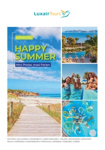 3 HAPPY SUMMER Mini Preise, maxi Ferien Liebe Reisende, der Sommer 2026 verspricht sonnige Aussichten, aufregende Entdeckungen und unvergessliche Momente! Ganz gleich, ob Sie Ruhe und Entspannung suchen, aktiv die Umgebung erkunden oder einfach das Leben in vollen Zügen genießen möchten, mit LuxairTours werden Ihre Urlaubsträume Wirklichkeit. Als erfahrener Reiseveranstalter kümmern wir uns um jedes Detail, damit Sie einen umfassenden Service genießen können. Bei Fragen oder besonderen Wünschen sind wir jederzeit für Sie da – vor, während undnach Ihrer Reise. Undsolltedocheinmal etwasUnvorhergesehenes passieren, können Sie sich auf uns verlassen. Wir sorgen dafür, dass Sie Ihre Reise vollkommen unbeschwert genießen können. Für die neue Saison haben wir unser Angebot um einige attraktive Reiseziele erweitert: Entdecken Sie die malerische Insel Zakynthos sowie die sonnigen Küsten der Costa Brava und der Costa Blanca. Ob gemeinsame Zeit mit der Familie, spannende Entdeckungstouren oder pure Entspannung am Strand, mit unseren Rundum-sorglosPauschalreisen wird Ihr Urlaub zu einem unvergesslichen Erlebnis, das in Erinnerung bleibt. Lassen Sie sich von den folgenden Seiten inspirieren. Ihr nächster Urlaub mit LuxairTours wartet bereits auf Sie! Ihr LuxairTours-Team MEHR ALS 50 JAHRE ERFAHRUNG FÜR IHREN PERFEKTEN TRAUMURLAUB Seit 1968 steht LuxairTours für Reisen, die Qualität, Vertrauen und persönliche Betreuung vereinen. Unsere engagierten Reiseexperten prüfen jedes Hotel persönlich und mit größter Sorgfalt, um Ihnen unvergessliche Urlaubsmomente zu ermöglichen – voller Ruhe, Komfort und außergewöhnlicher Erlebnisse.
